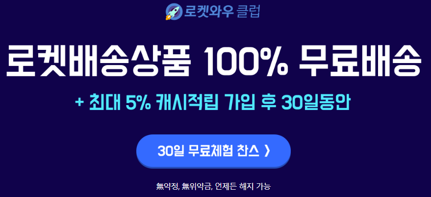 물론 로켓와우클럽 멤버십이 아닌 분들을 위한 팁도 있습니다 쿠파와우 행사기간동안 30일 무료체험 찬스를 통해서 언제든 해지 가능하고 30일간 무료 체험 후 월 2,900원 멤버십 서비스를 이용하는 방법도 있습니다