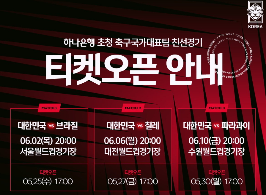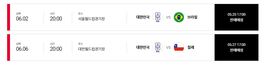 대한민국 축구 A매치 경기 티켓 예매 (브라질, 칠레, 파라과이)