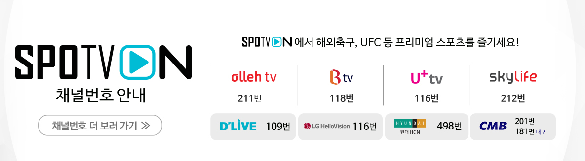 무료 시청 방법 스포츠 중계를 시청하는 곳은 많지만 화질이 좋지 못하더거나 불편사항이 많지는 않나요 UFC 중계 뿐만 아니라 프리미어리그 메이저리그 야구 농구 등 다양한 경기를 스포츠 전문 채널을 통해서 시청하시면 원하시는 경기를 마음껏 시청하실 수 있습니다.
